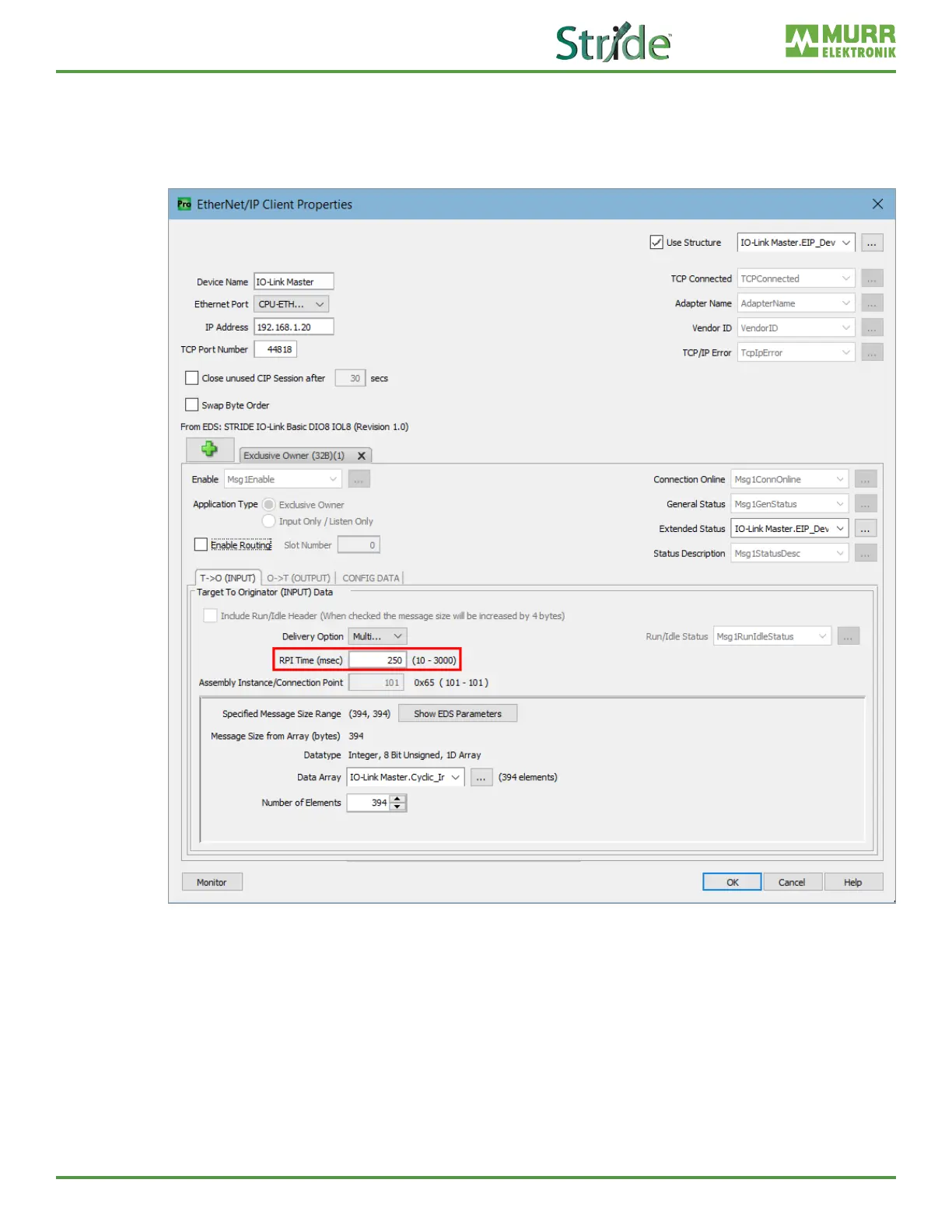 Fig. 8-2: EtherNet/IP Client Properties – T->O (Input) RPI Time.
