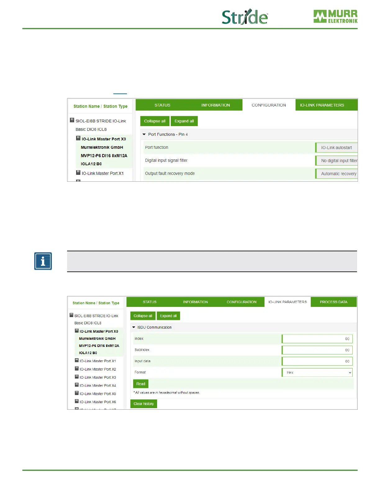 In this menu item, the ISDU (Index Service Data Unit) of the device can be read during IO-Link operation.
