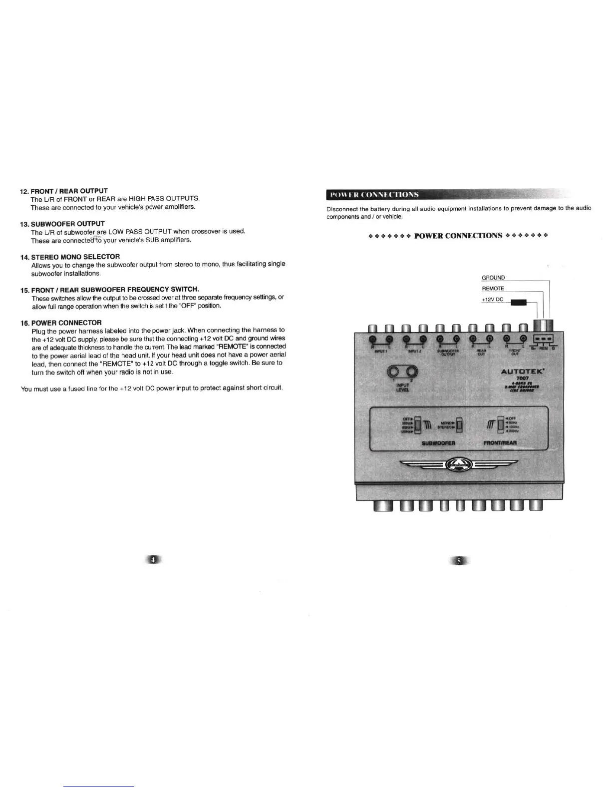 Autotek 7007 - Power Connections and Outputs; Output Channels Explained; Subwoofer Mode and Frequency Settings; Power Connector and Wiring Guide
