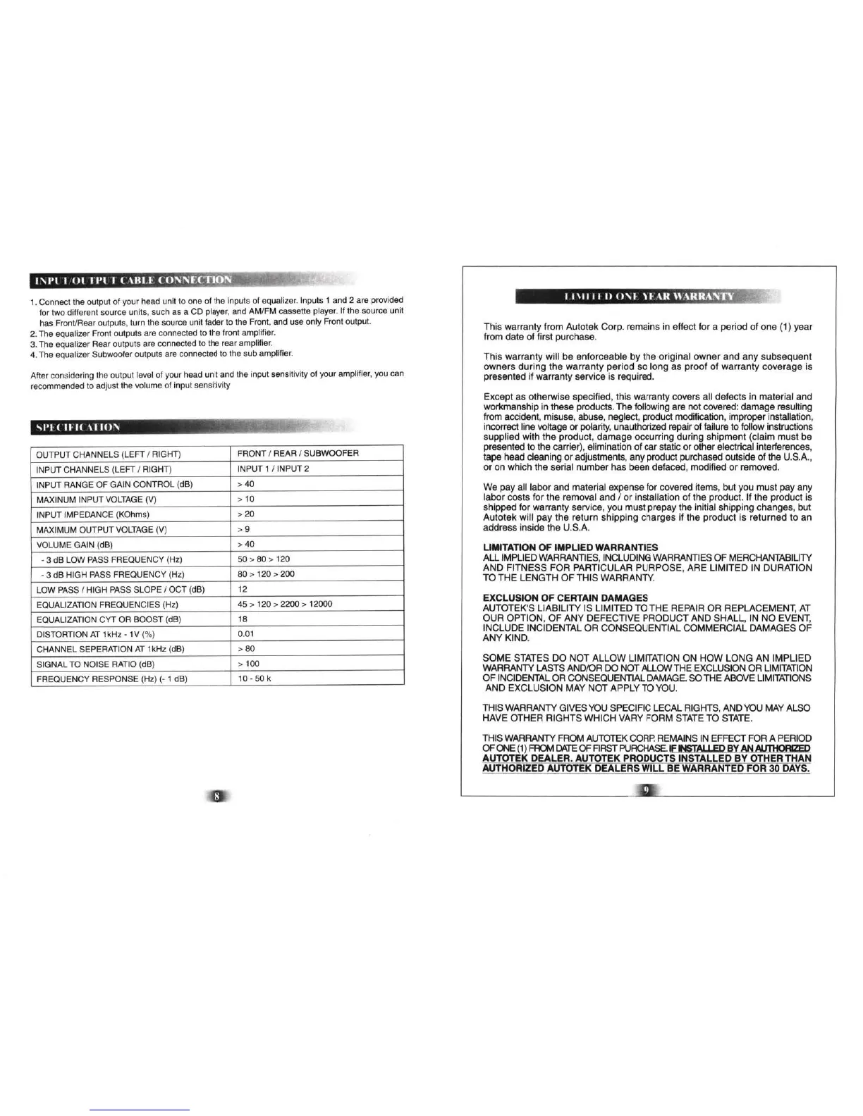 Autotek 7007 - Specifications and Warranty; Input;Output Cable Connection; Technical Specifications; Limited Warranty Information