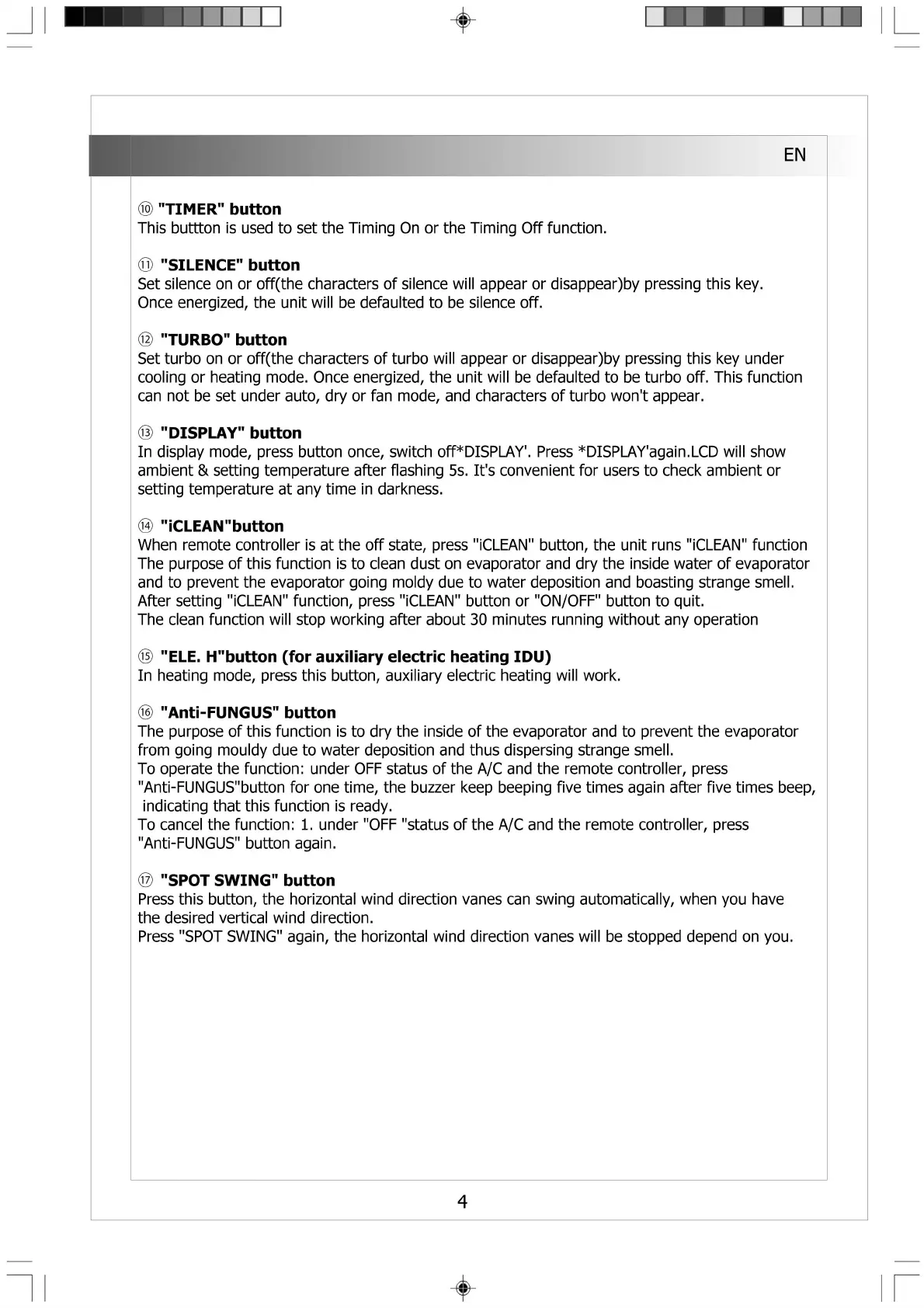 Press this button, the horizontal wind direction vanes can swing automatically, when you have