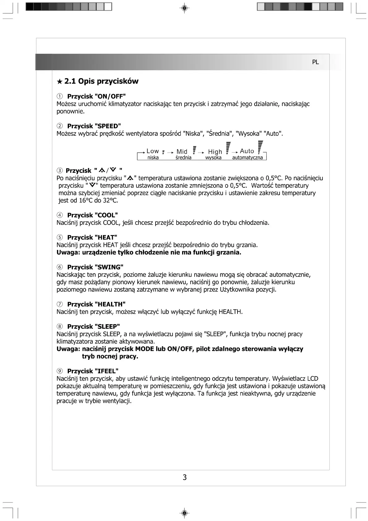 Uwaga: urządzenie tylko chłodzenie nie ma funkcji grzania.