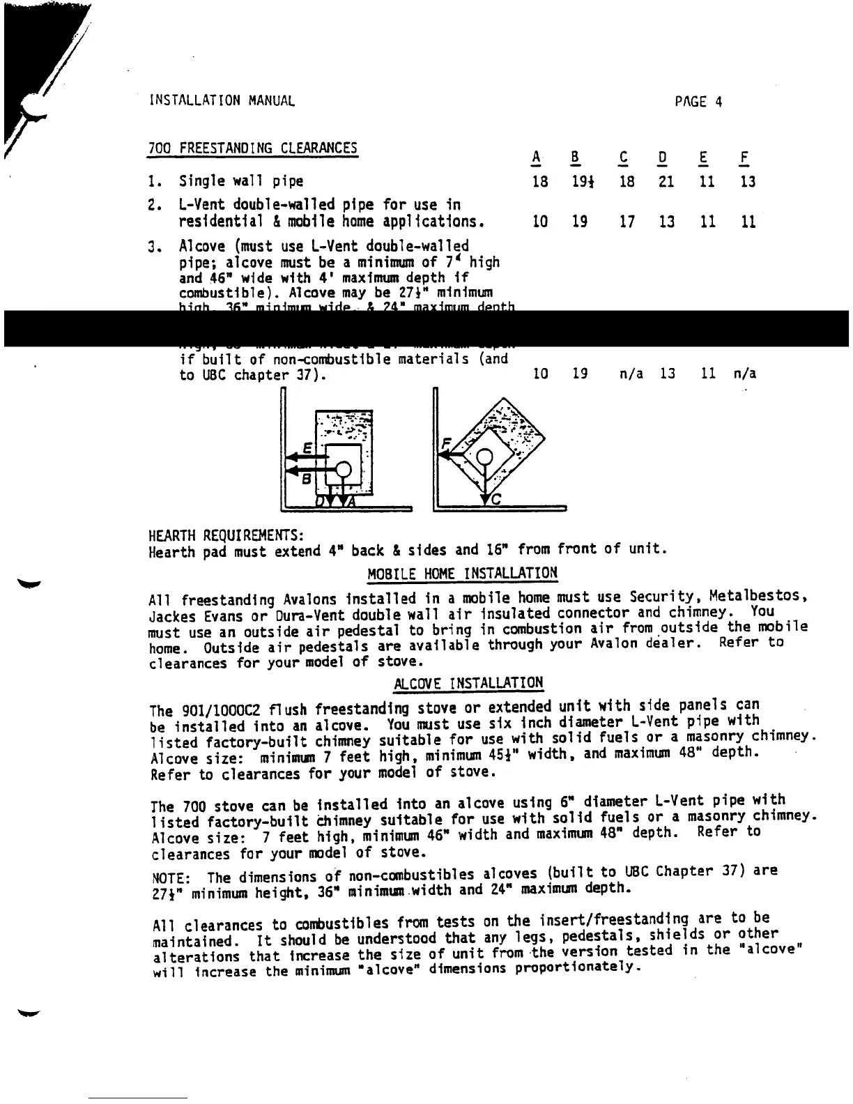 Avalon 901 - Hearth Requirements; Mobile Home Installation; Alcove Installation