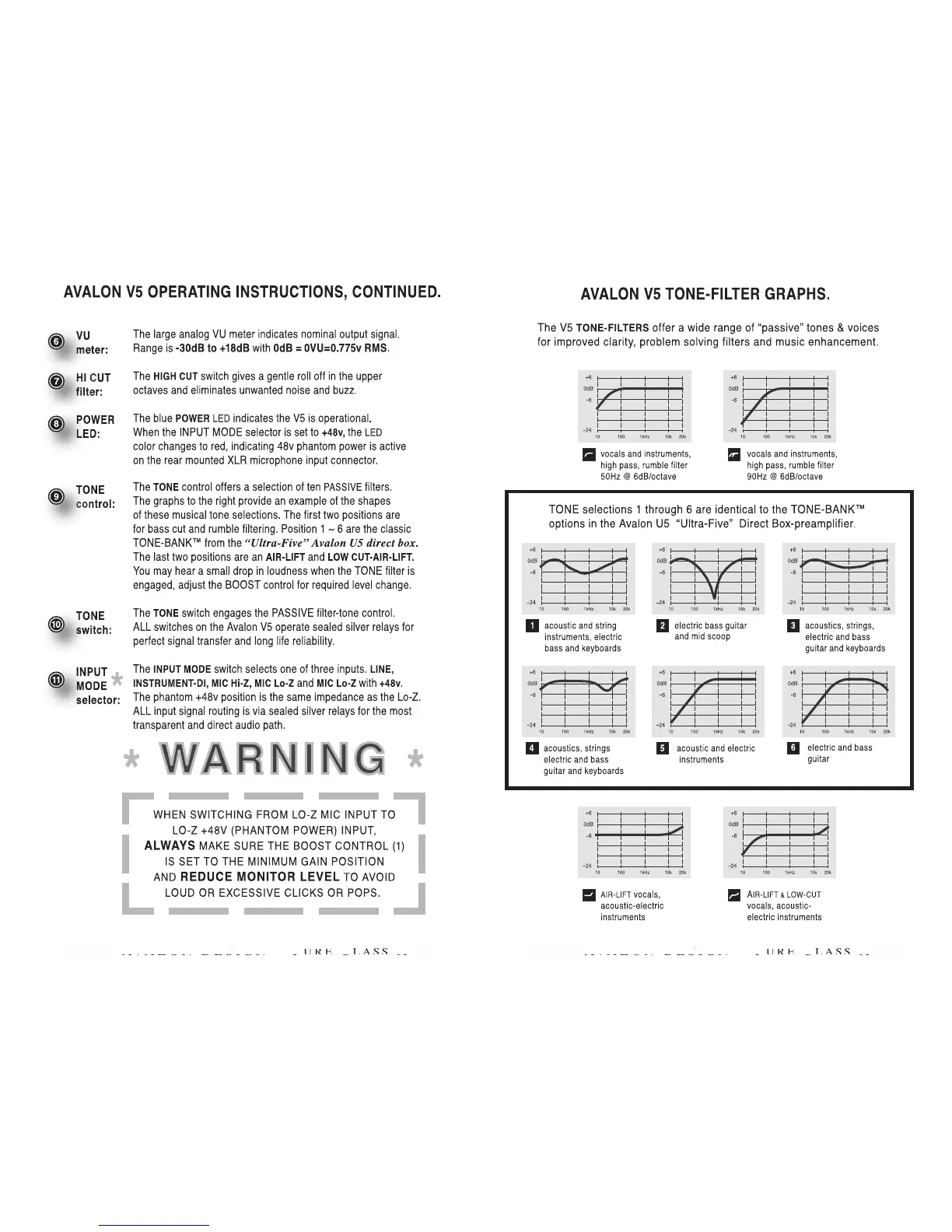 Avalon V5 - Operating Instructions and Tone Filters; VU Meter and Hi Cut Filter; Power LED and Tone Control; Tone Filter Graphs