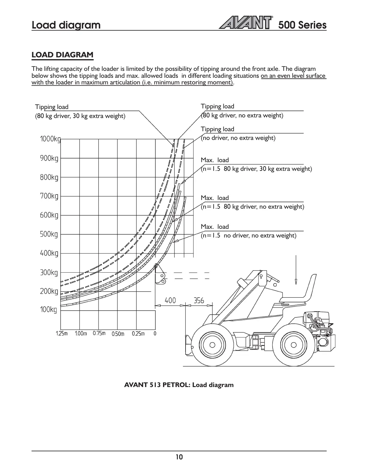 The lifting capacity of the loader is limited by the possibility of tipping around the front axle. The diagram