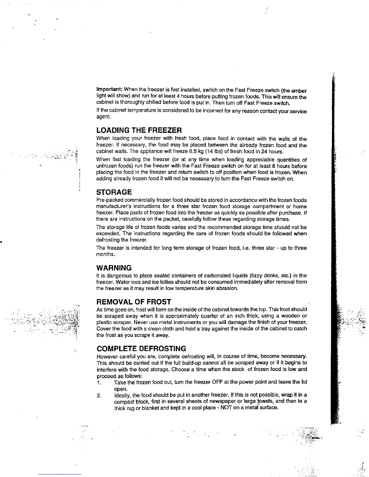 Avanti CF-49 - Loading the Freezer; Storage; Warning; Removal of Frost