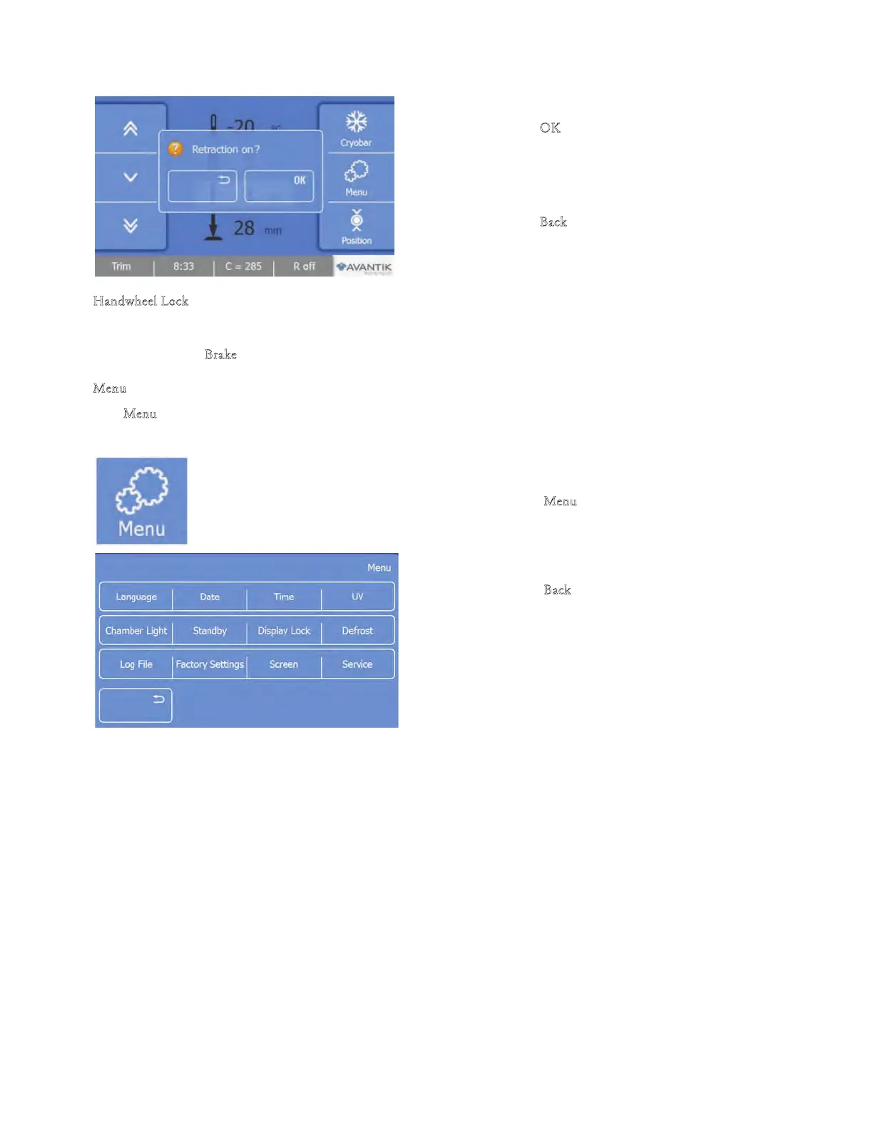enu" button provides access to submenus for adjustments and settings.