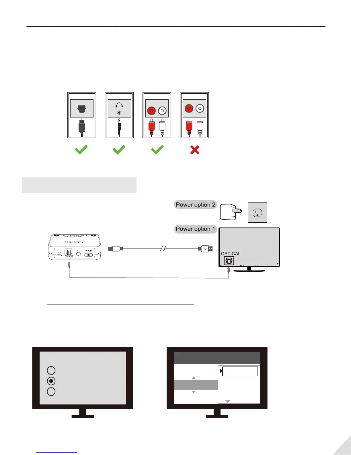 Ensure TV audio format is set to “PCM” or “Dolby/DTS” is OFF(This is IMPORTANT)