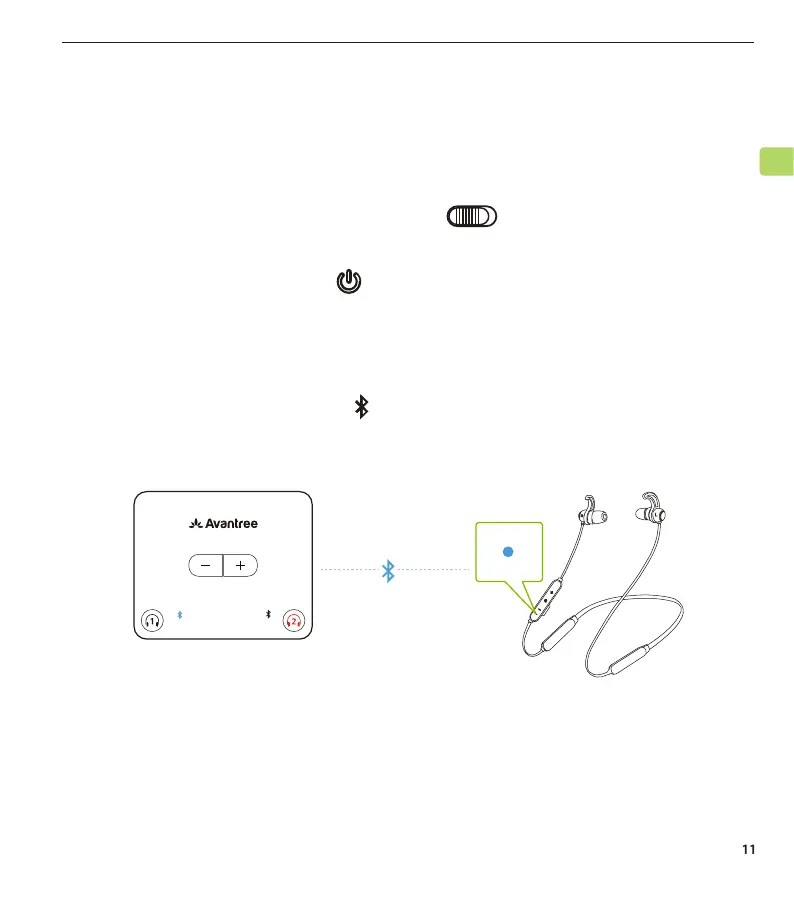 on the earbuds and the left on the transmitter will turn solid blue.