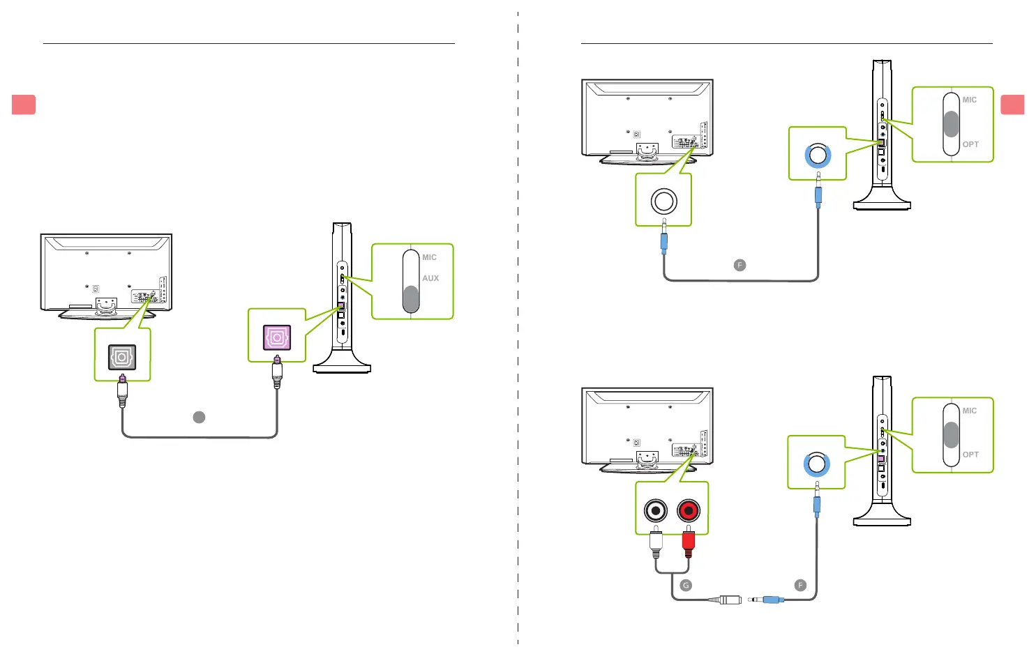 (Abbildung F) in den 3,5-mm-AUX-Ausgang des Fernsehers und dann das andere Ende in