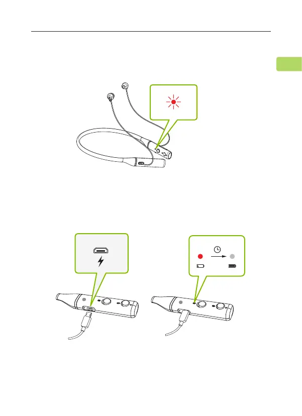 The earbuds' LED will ash red every 5 seconds to indicate low battery.