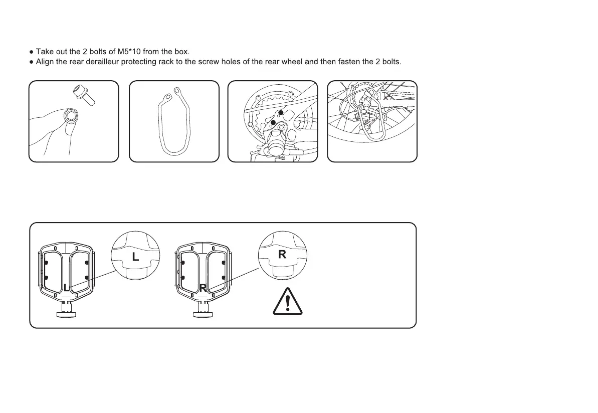 1. Identify the correct side by finding the marked ‘R’ and ‘L’ at the pedals. Each pedal has an “L” sticker or “R” sticker to indicate left or right side of the eBike.