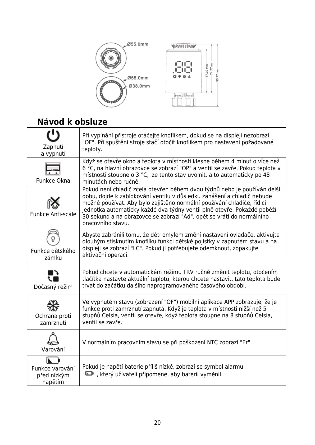 6 °C, na hlavní obrazovce se zobrazí "OP" a ventil se zavře. Pokud teplota v