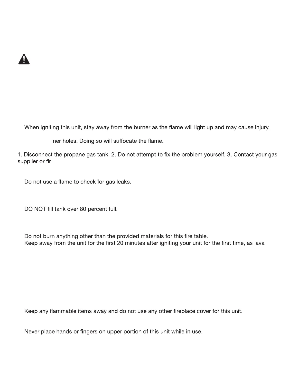 • LP GAS WARNING: Do not use any more than 1/4in depth lava rocks/pumice stones/LavaGlass