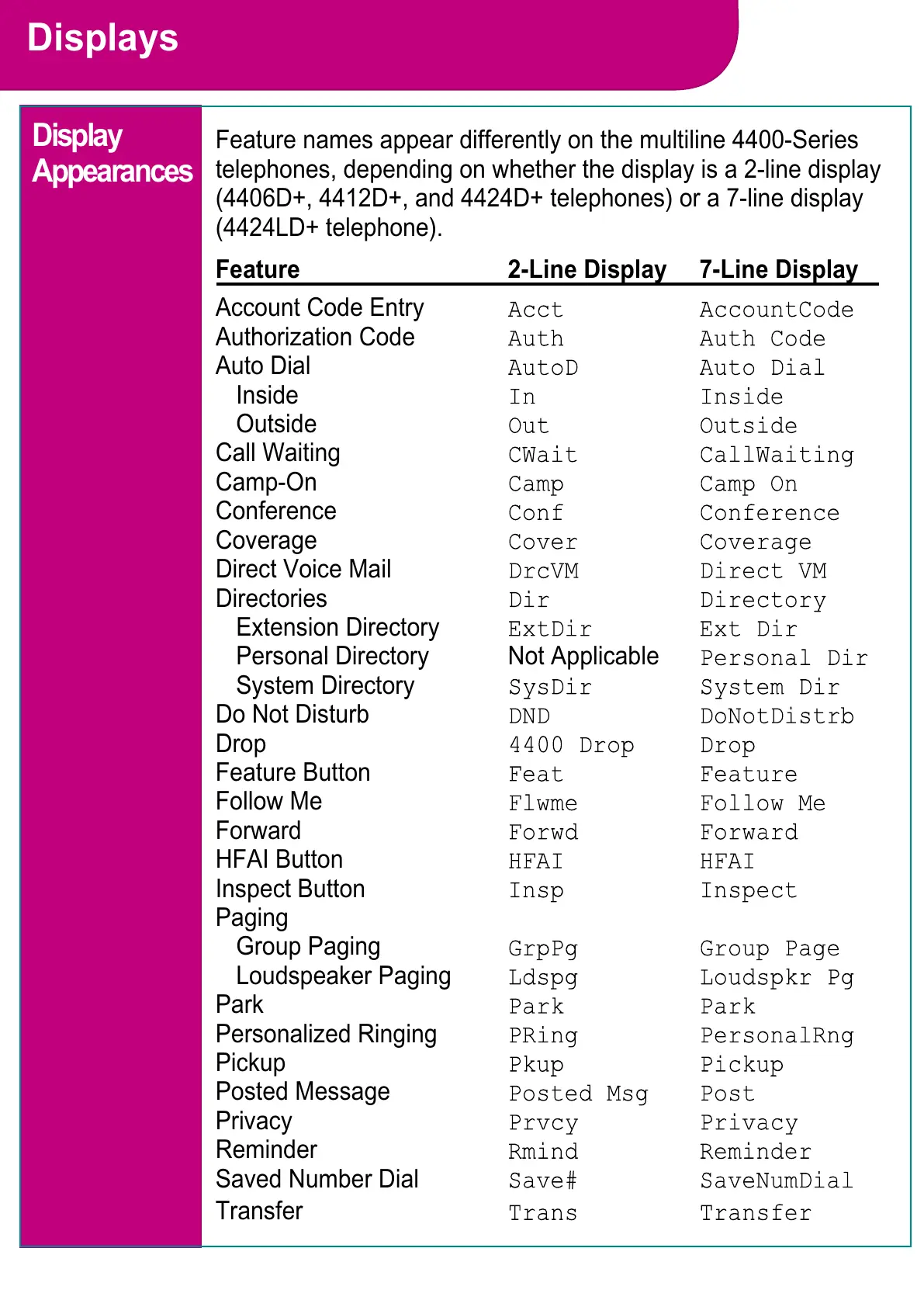 (4406D+, 4412D+, and 4424D+ telephones) or a 7-line display