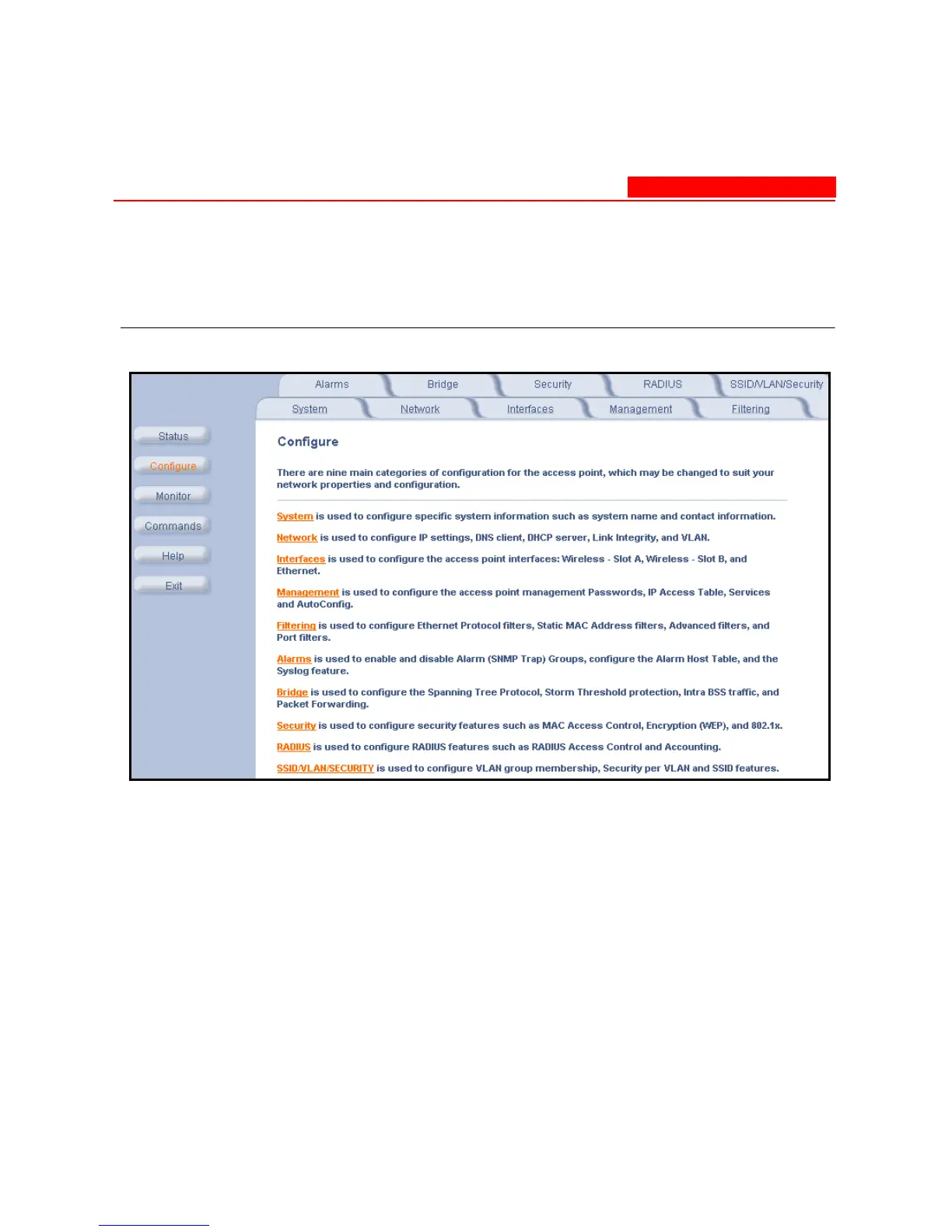 of the configuration categories are described later in this chapter.