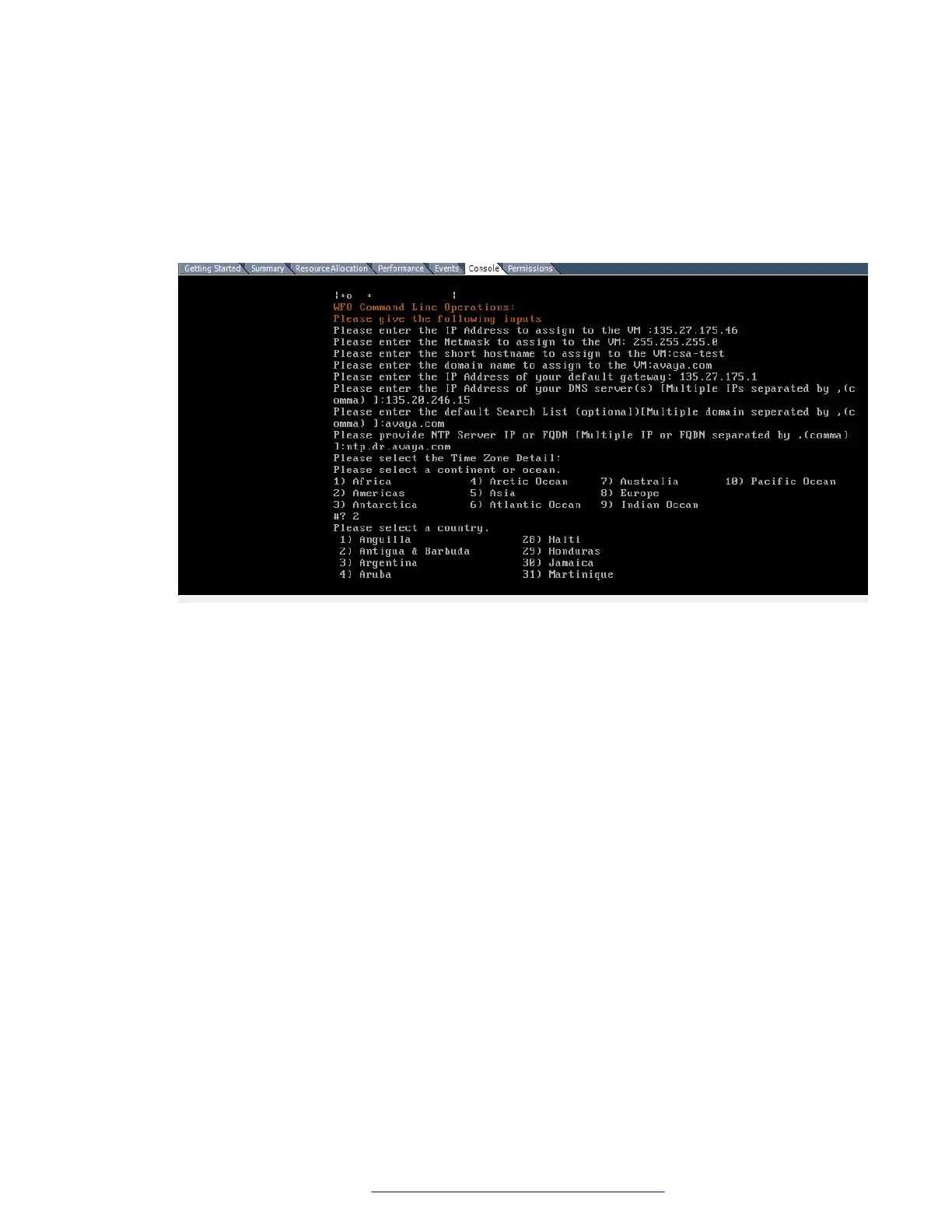 The following image provides an example of network and IP settings in the VM console: