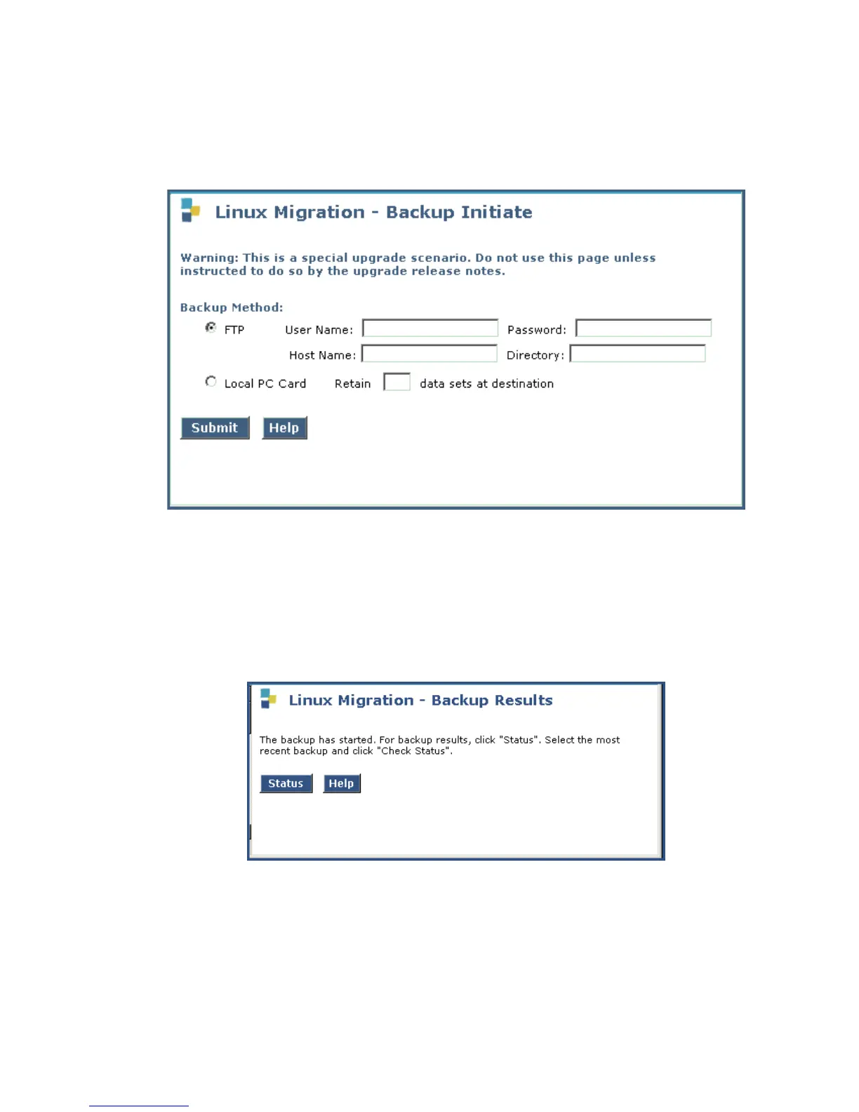 Linux Migration - Backup Initiate screen