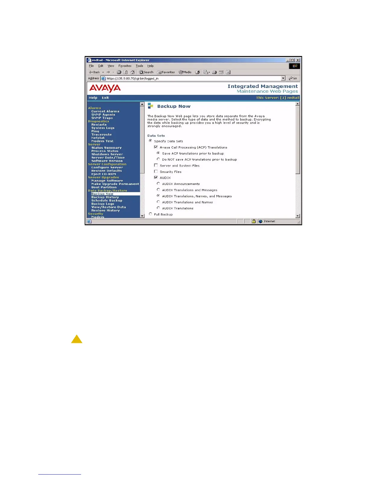 CAUTION: Selecting the Full Backup radio button does NOT include AUDIX files.