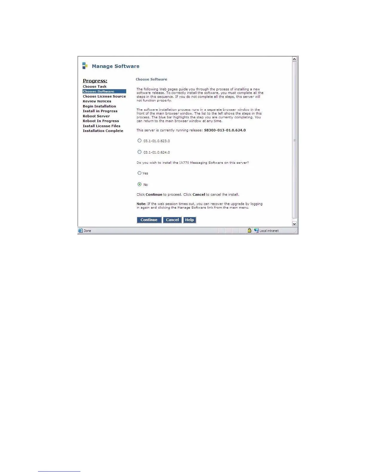This screen will show the release currently running on the S8300B, and the releases resident on