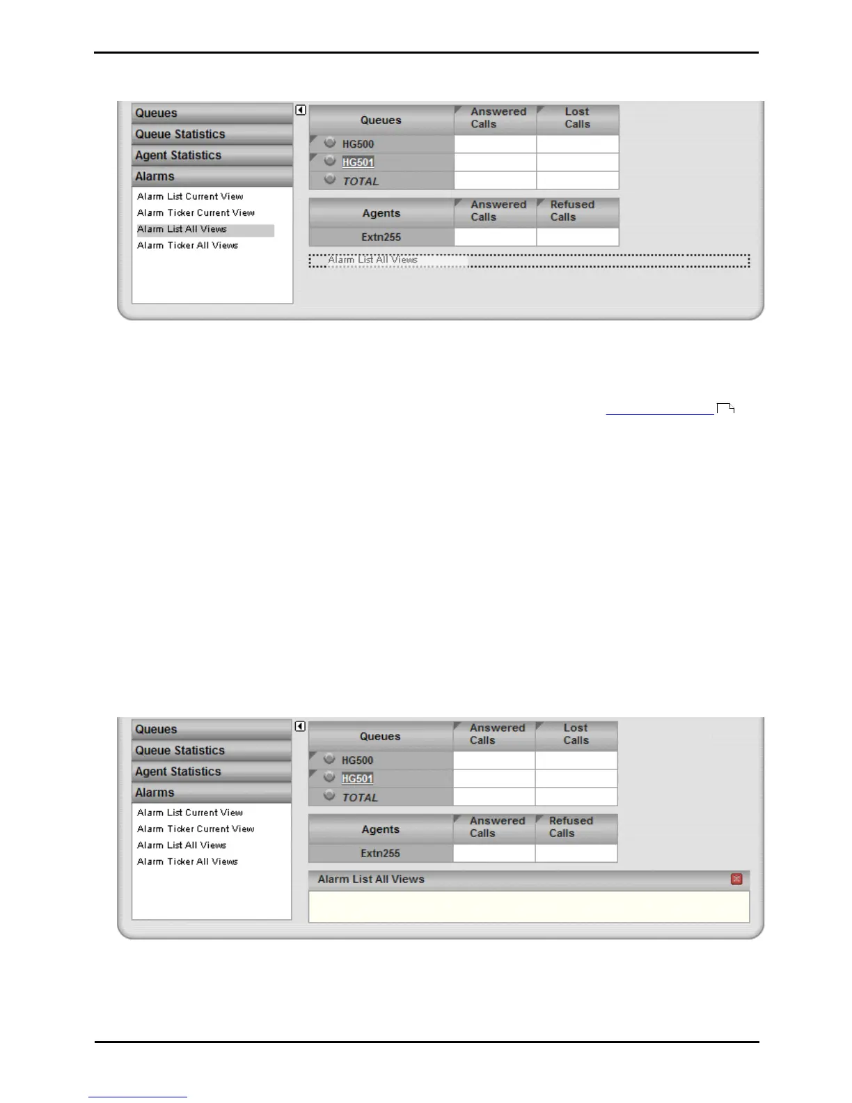 · Alarms and warnings take the form: Time, Type (Alarm or Warning), Name (Queue name, agent name),