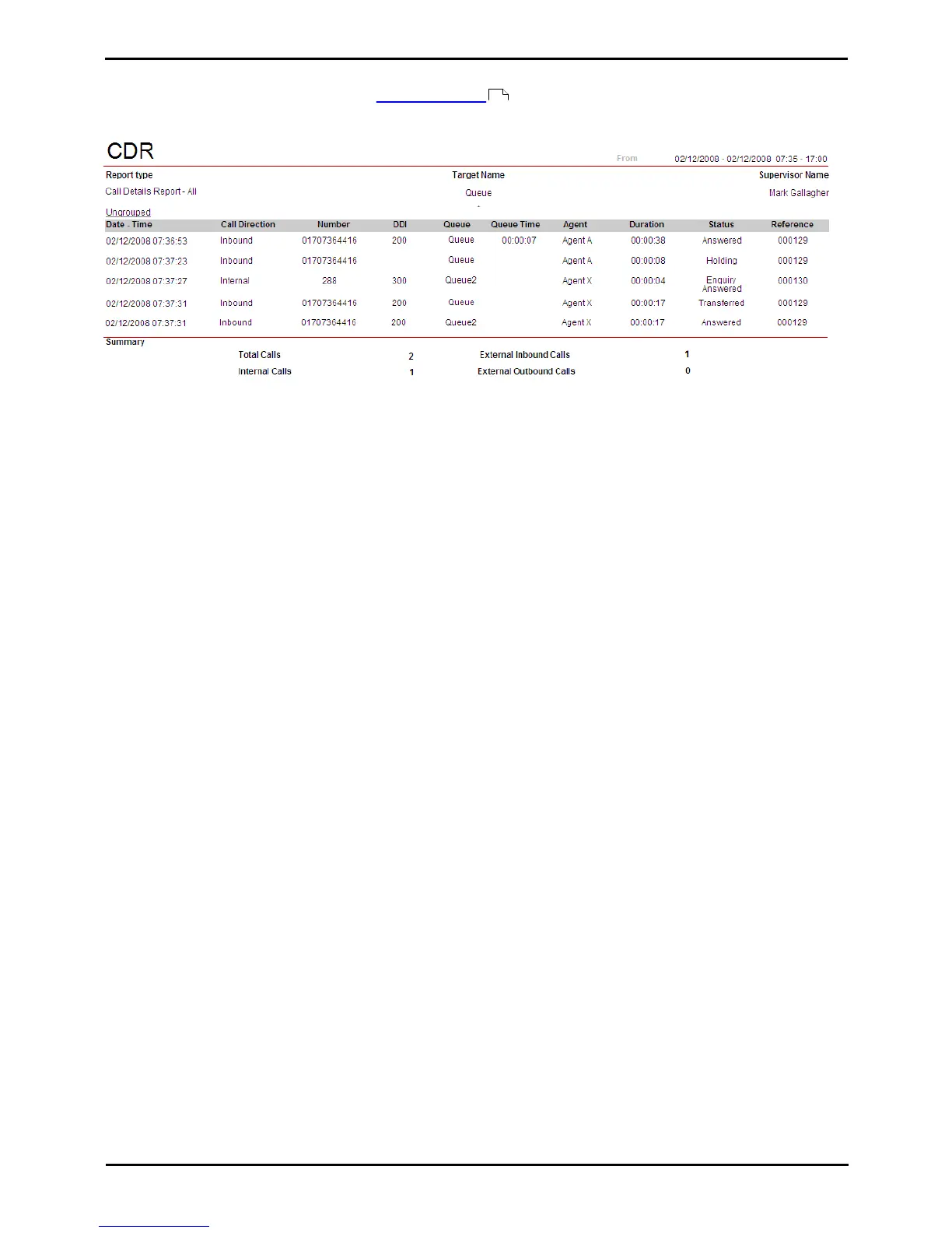 The following is an example report, using the Call Details Report template, for a supervised transfer from queue to