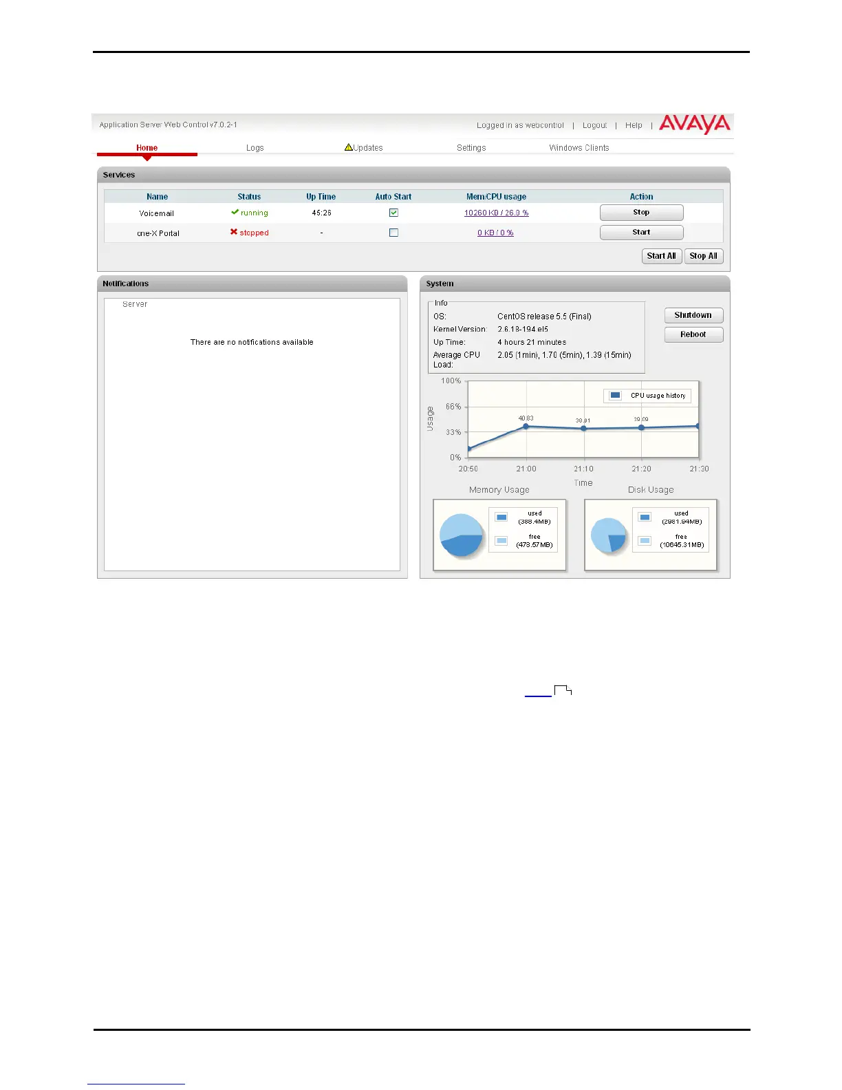 This table gives a general overview of the sever status. This section also provides controls to shutdown or reboot