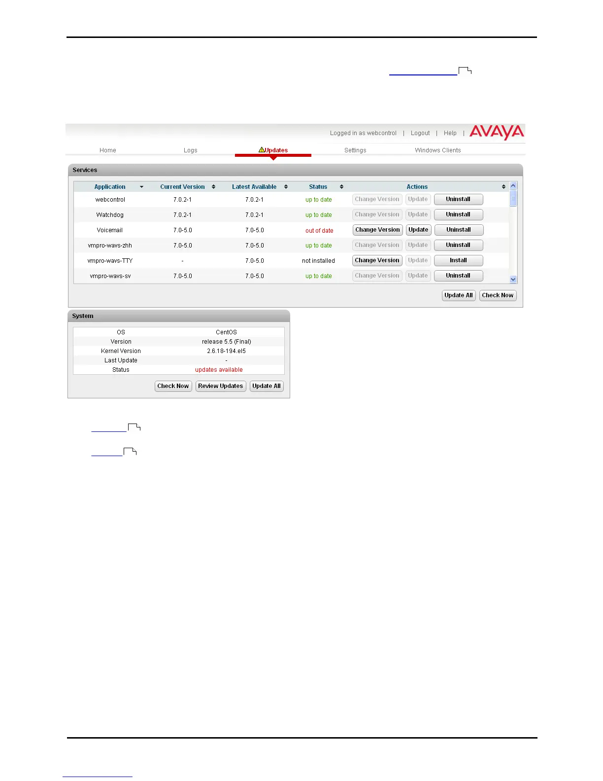 This section displays the current version of application files and whether update files are available.