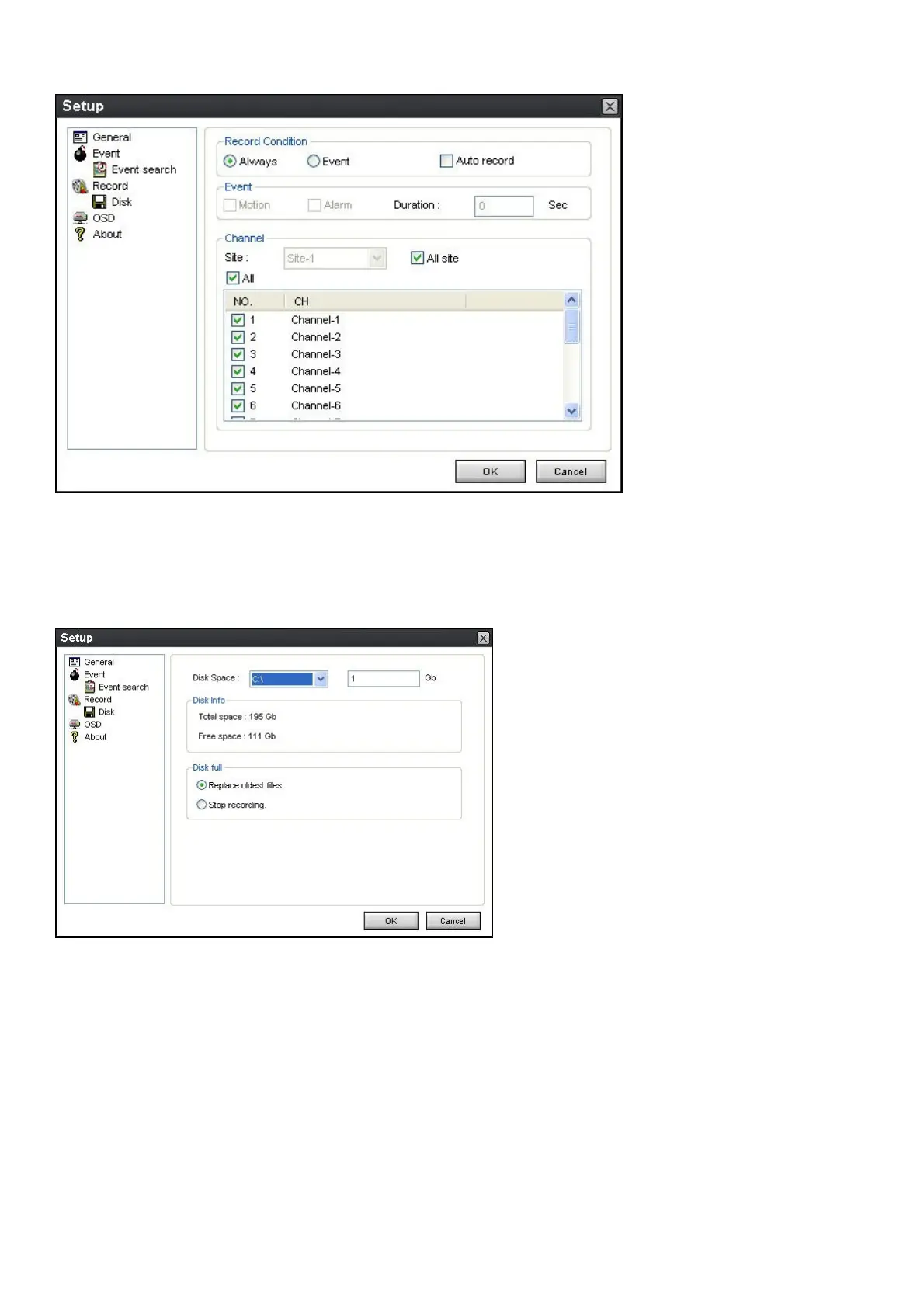 9-6-3-2. Record local storage setup: You can select the local disk to use and the amount of disk space