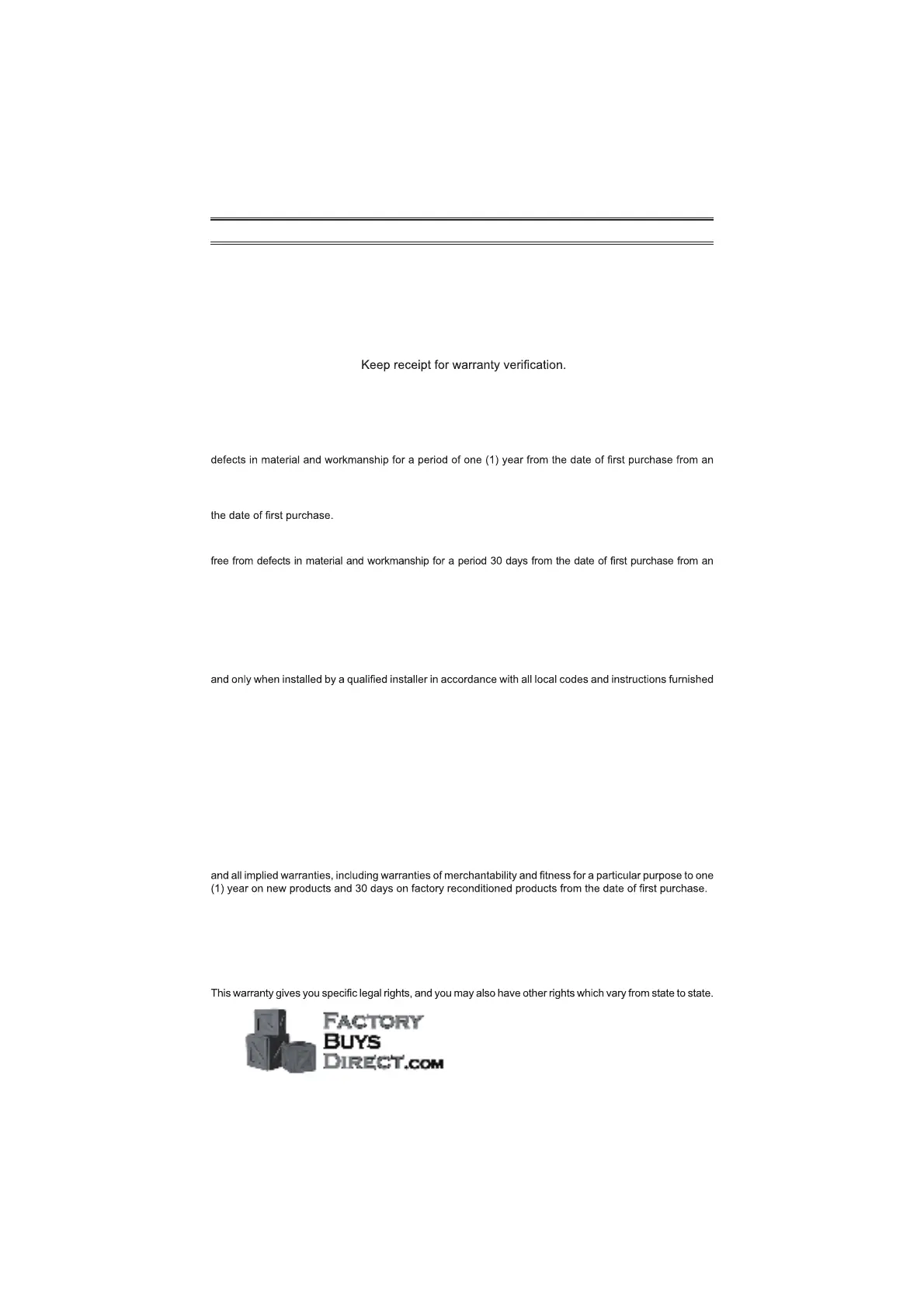 Standard Warranty: Factory Buys Direct warrants this new product and any parts thereof to be free from