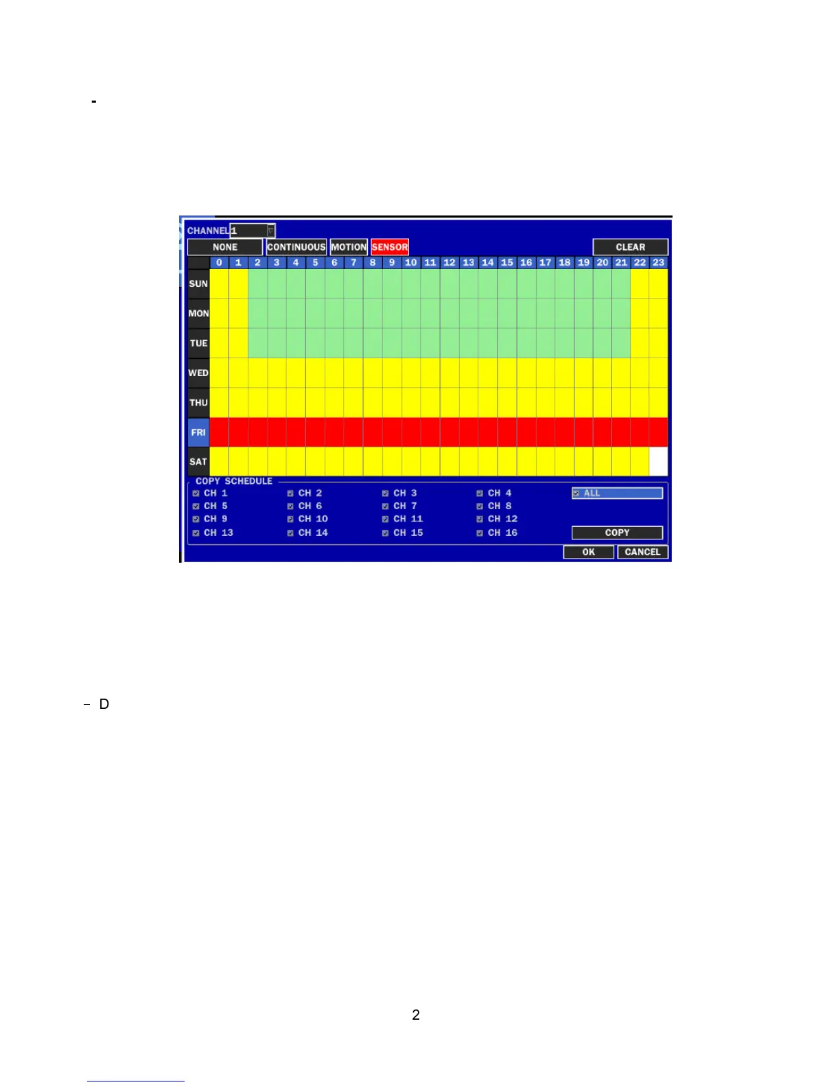 Once the channel 1 is selected, SCHEDULE-CH1 screen is displayed. Select ALL or each day using the