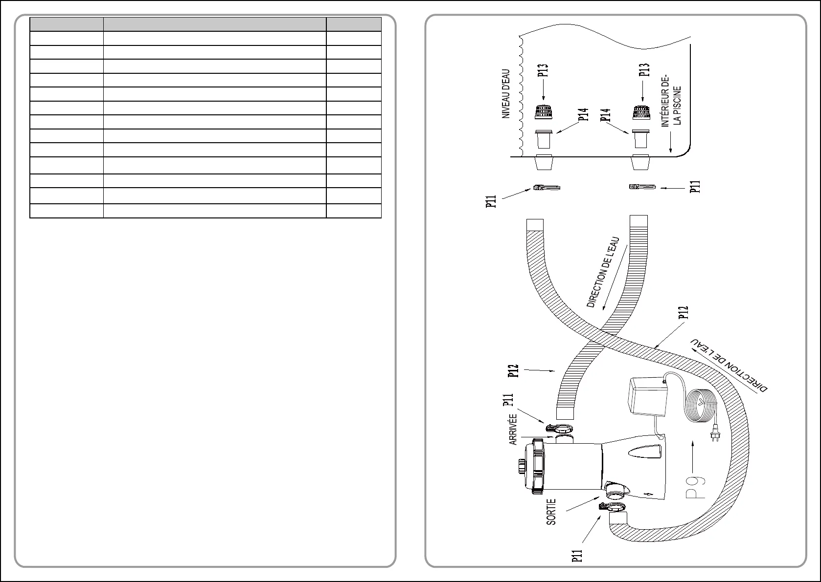 au raccordement de tuyau inférieur de la piscine. Fixez le tuyau avec les colliers de serrage (P11).