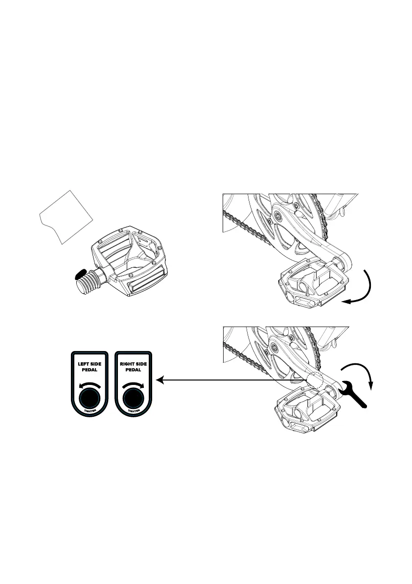1. The right pedal (pedal with "R" sticker label) is threaded so that it is tightened by turning clockwise.