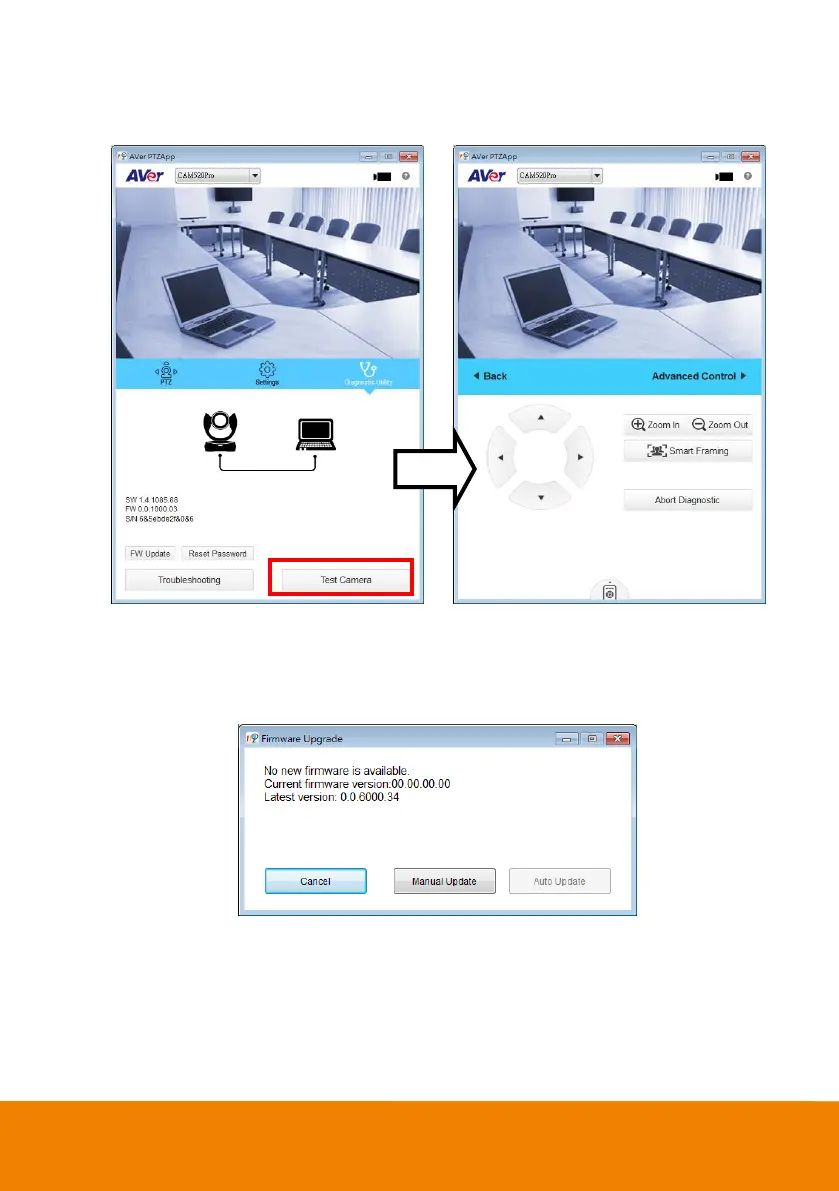the camera direction and view of the zoom in/out. To leave the page, click the Abort Diagnostic