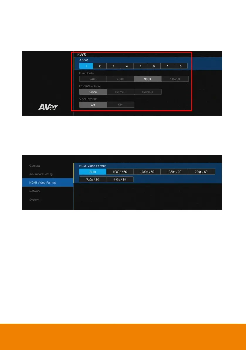 Baud Rate, VISCA Protocol, Visca Over IP settings.