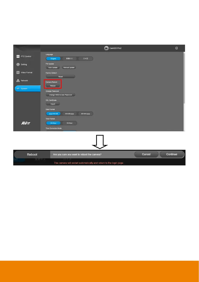 1. Select System > Camera Reboot > Reboot.