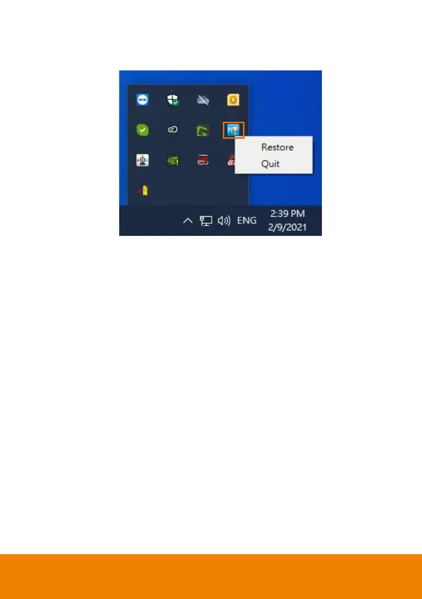 10. PTZApp 2 Quit & Restore: To quit the application, right-click the icon on the system tray and