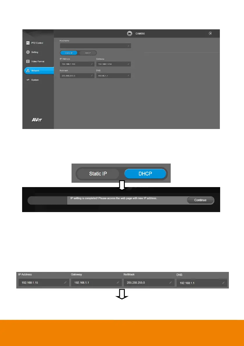 Select Network > DHCP. A message is shown and clicks Continue to confirm.