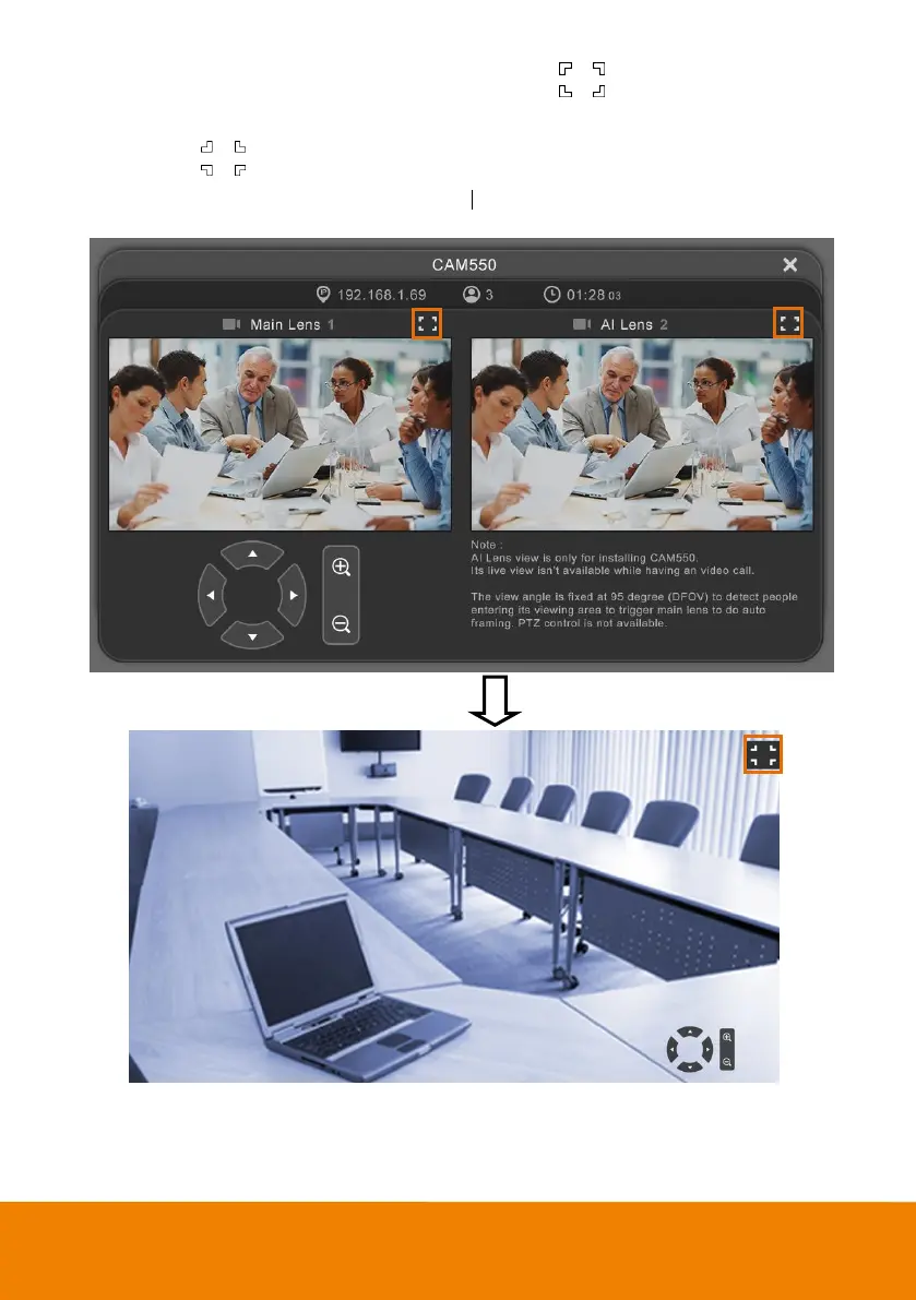 will switch to full screen mode. In full screen mode, user can use direction panel to control camera