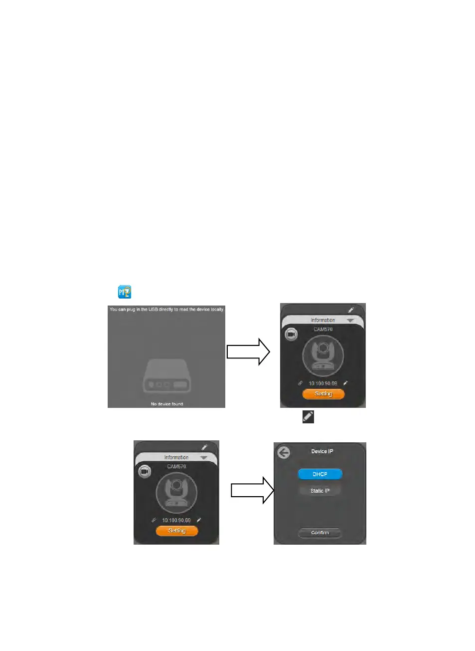 3. 카메라의 기본 IP 주소는 192.168.1.168 입니다. 연필 아이콘( )을 클릭하여 IP 주소를