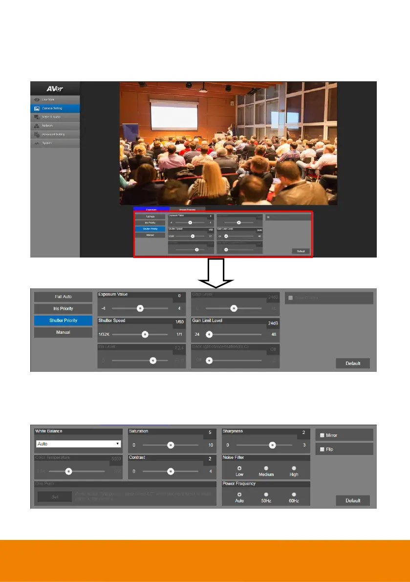 Setup the exposure type -- Full auto, Iris priority, Shutter priority, or manual.