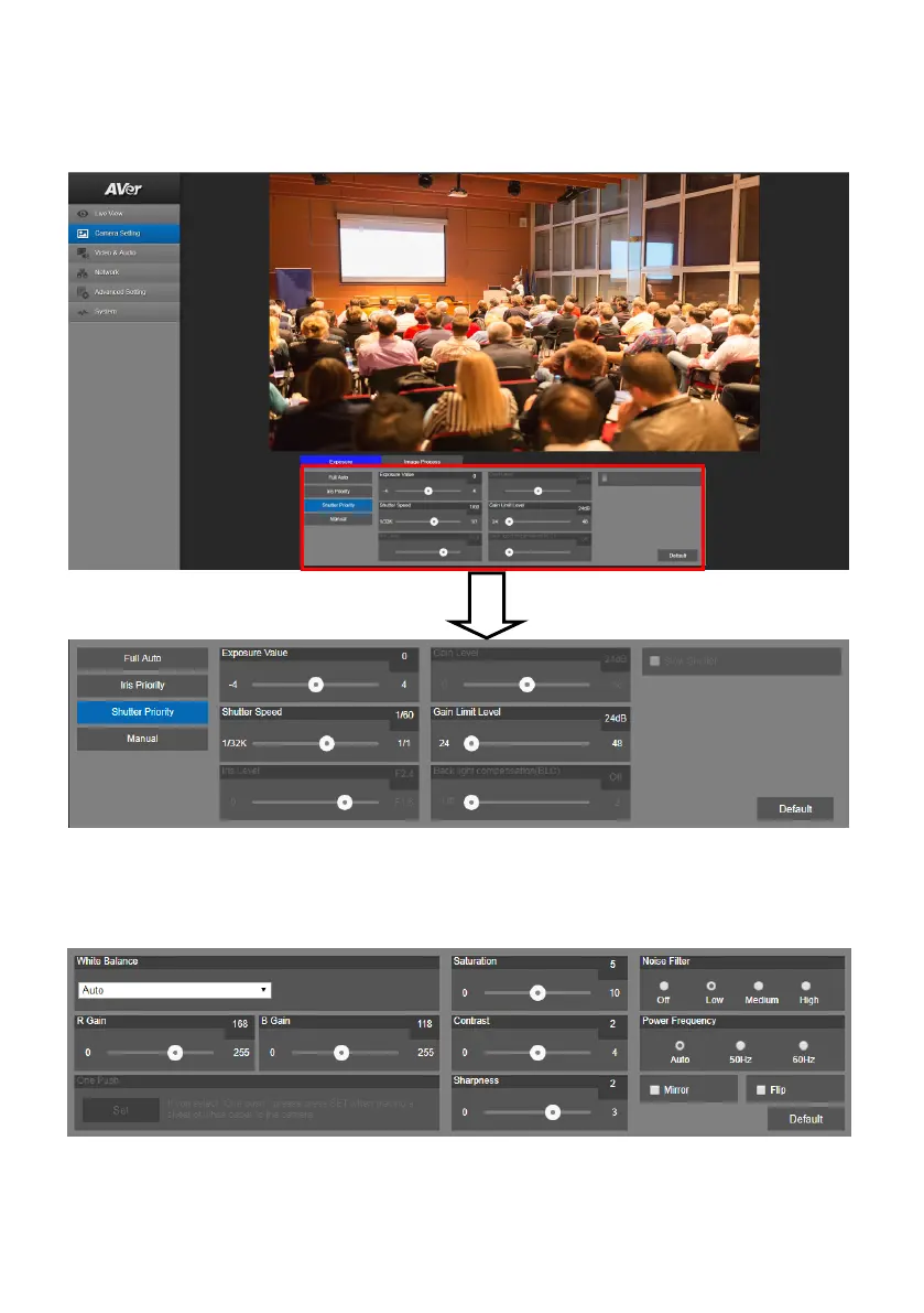 Setup the white balance, saturation, contrast, sharpness, noise filter, power frequency, mirror, and flip.