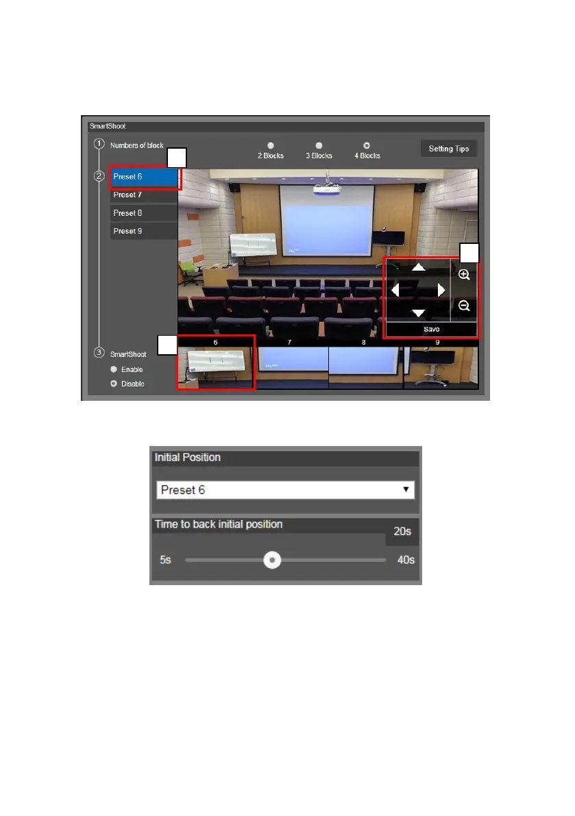 camera to wanted position and select “save” to save the preset position. And, a snapshot of the
