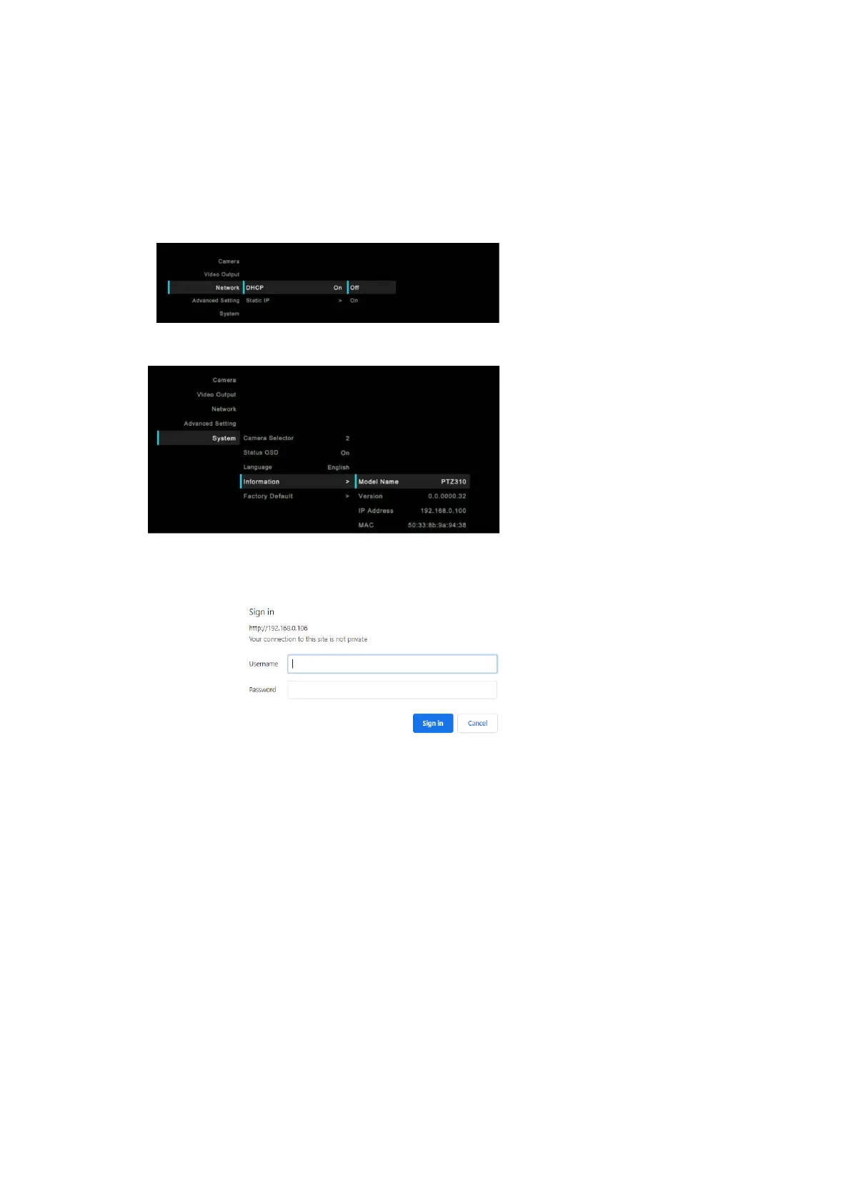 1. Connect the PTZ330 camera via Network RJ45 connection; verify IP address of Camera to