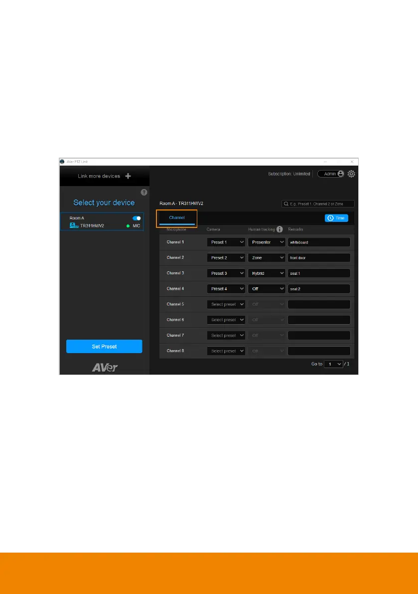by pairing up microphone channels and camera preset