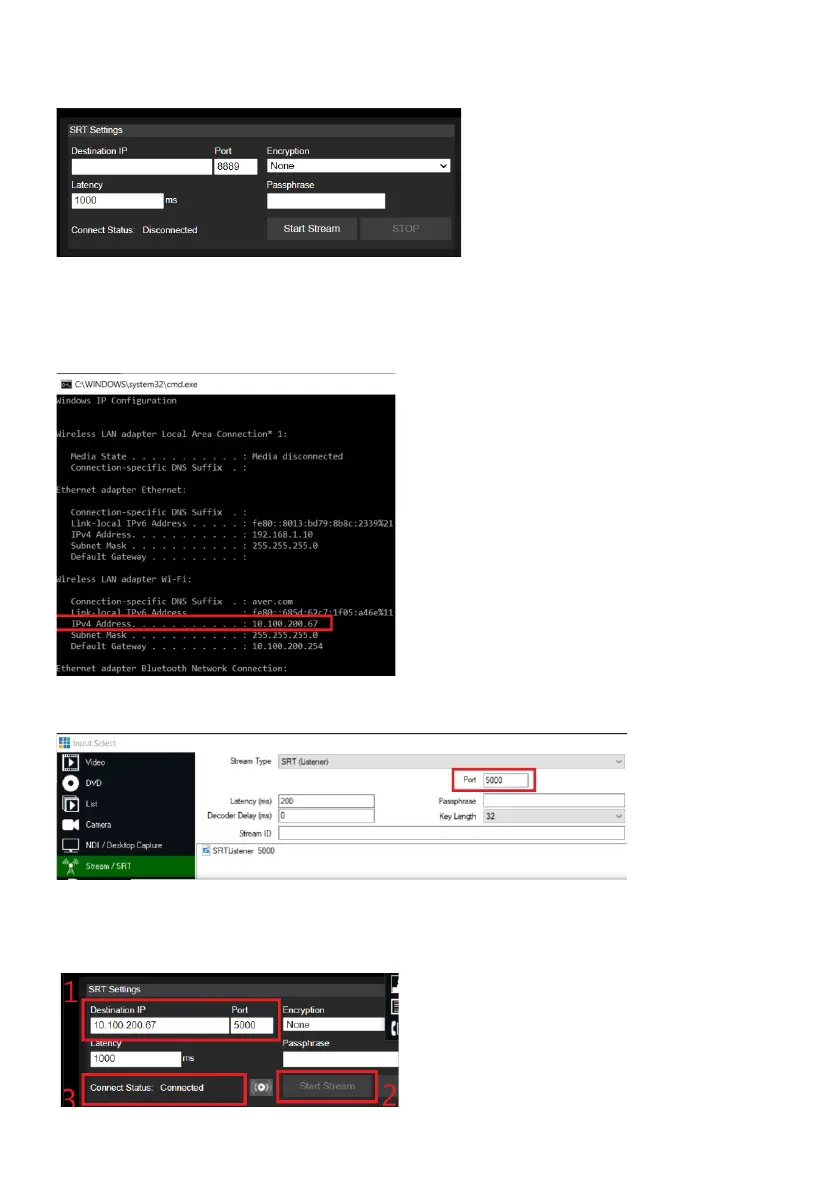 Enter the information into the SRT Settings TR311 web interface, then click on “Start Stream”, Connect