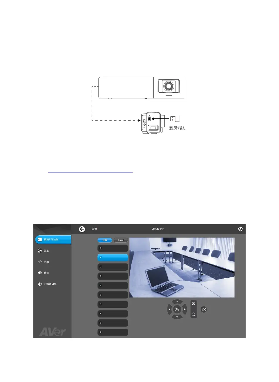 在開啟電源前,先將藍牙模組插入 USB 2.0 Type-A 埠。開啟電源後,使用遙控器或 PTZApp 2 來啟用