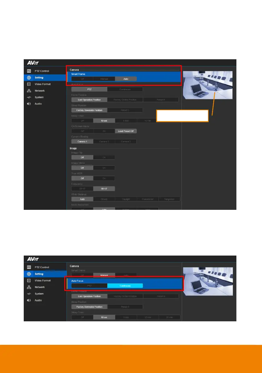 In live screen view, select Setting > Camera > Auto Focus > PTZ or Continuous.