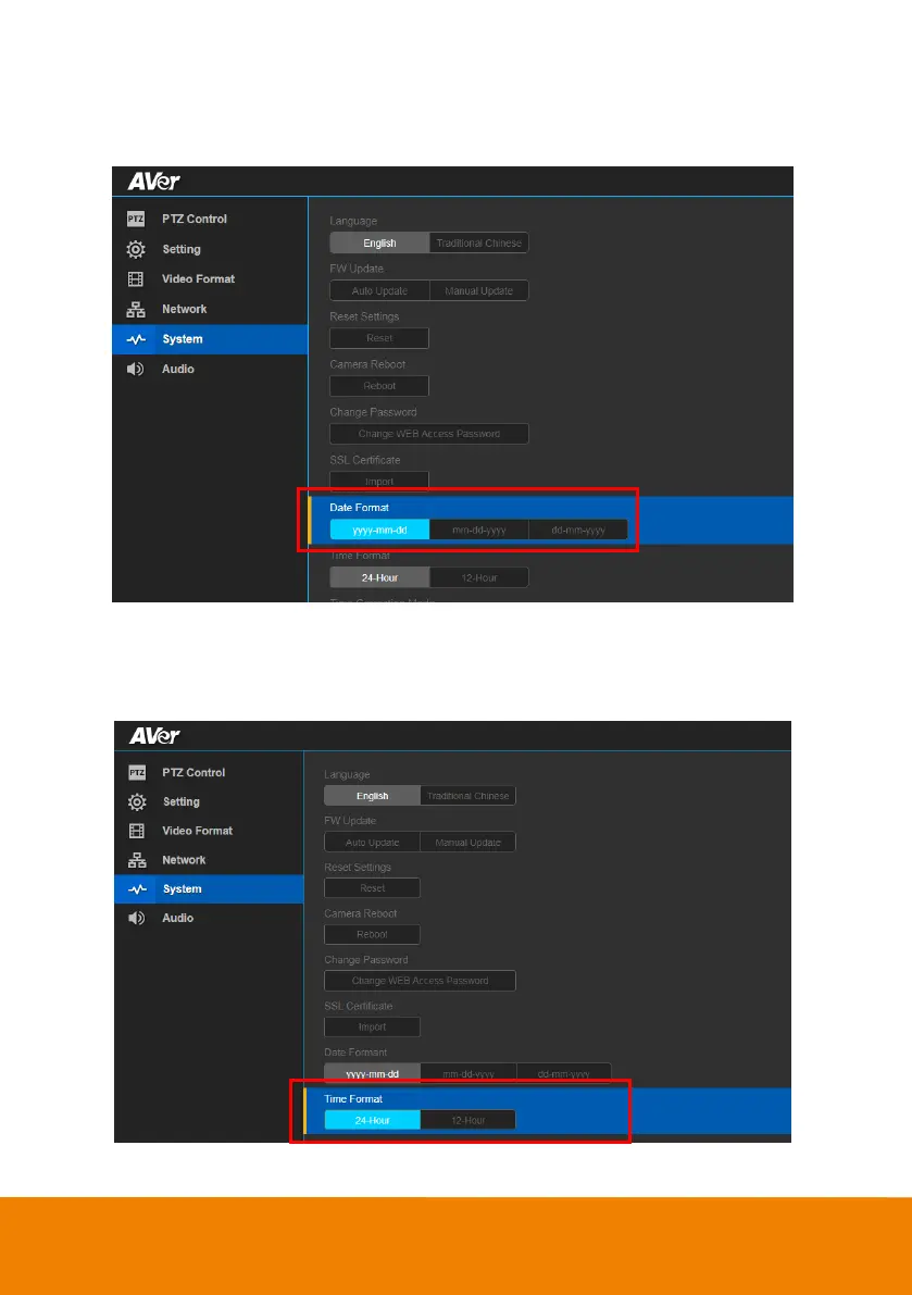 In live screen view, select System > Date Format > yyyy-mm-dd, mm-dd-yyyy, or dd-mm-yyyy.