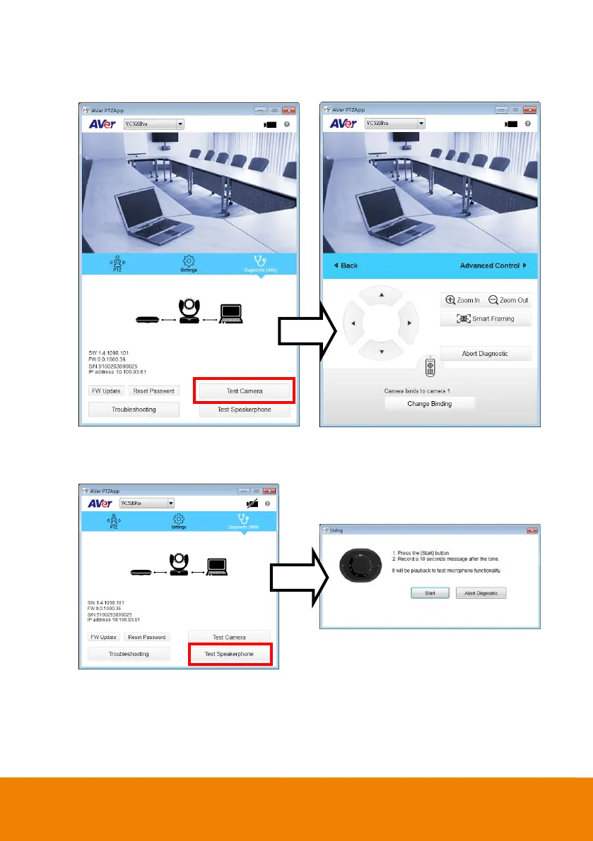 the camera direction and view of the zoom in/out. To leave the page, click the Abort Diagnostic